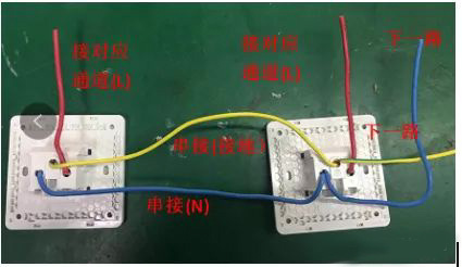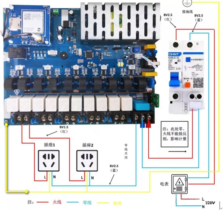 插座的火线对接主板通道的火线,多个插座的零线和地线进行串接。
