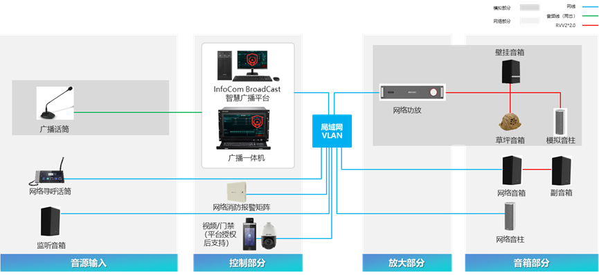 广播广播平台: 支持PC客户端、web端、app端,同时支持视频、报警、门禁类的设备接入和联动管理,整体方案由音源输入——广播话筒、网络寻呼话筒、监听音箱(按需选择),控制部分——智慧广播平台*,视频/门禁设备(可选项,购买授权后支持) 、放大部分——功放、音箱部分——模拟/网络音箱组成。