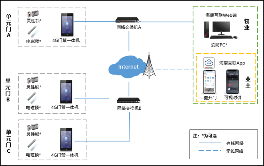 针对传统门禁对讲改造方案成本高、耗时长的痛点问题,推荐采用“海康互联云平台”,搭配4G门禁一体机系统,为用户带来轻量化、易部署的一体化解决方案。