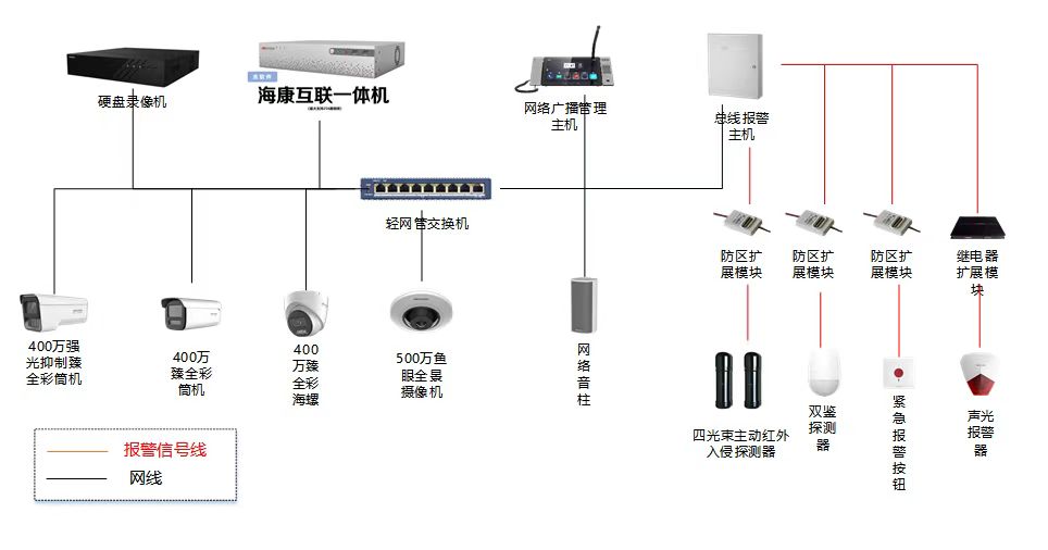 选用海康威视总线报警主机DS-29A08-01BN,支持8个板载有线防区,可直接接入室外油罐区红外入侵探测器、室内财务室双鉴探测器、紧急报警按钮,如距离较远,或通过总线扩展模块接入。通过报警主机的警号输出连接海康威视DS-RS1-R/B声光报警器。通过海康互联平台接入报警系统和视频系统,做相应配置实现视频与入侵报警系统的联动,有报警发生时,能及时联动现场视频来复核。